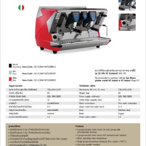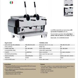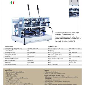 - TECHNICAL DATA Dimensions (W x H x D, mm.) : 780 x 485 + 315 x 530 Weight (kg.) : 80 Power supply (watt) : 220, 380/ 3,500 Coffee boiler capacity (liter) : 12 Water connections : Firm water connection Steam wand / hot water wand : 2/1 Body : Stainless steel with a chrome Boiler : Copper Power cable…