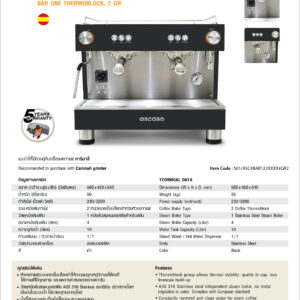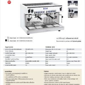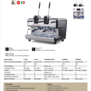 ฿590,000.00฿560,500.00 - Technical Data Dimensions (W x H x D, mm) : 710 x 533 x 590 Weight (kg) : 61 Power supply (Volt/Watt) : 220/4600 Water connections : Firm water connection Coffee boiler capacity (liter) : 2 x 1.3 Steam boiler capacity (liter) : 7 Steam wand / hot water wand : 2/1 Body : Stainless Steel Boiler : Stainless Steel…