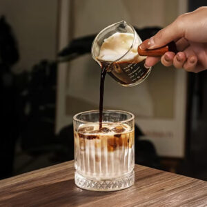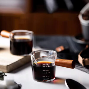 - - 75 ml Milk Measuring Cup - Dual spout design for easy pouring - Made of borosilicate glass, heat-resistant - Wooden handle provides a secure, non-slip grip