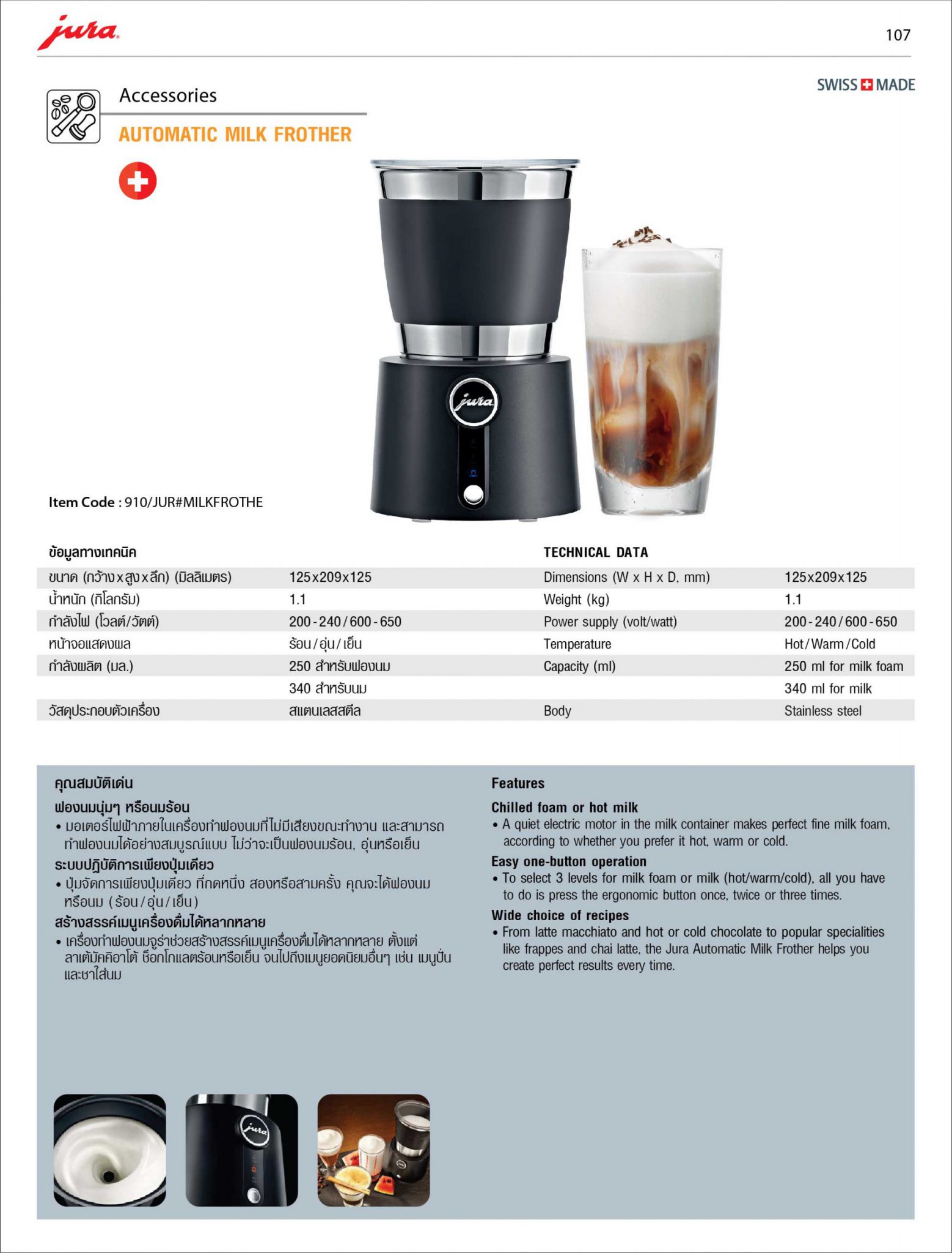 Capacity : 250 ml for milk foam / 340 ml for milk