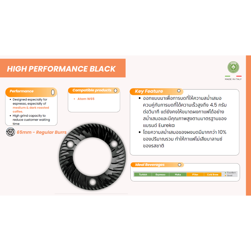 – ออกแบบมาเพื่อการบดที่ให้ความสม่ำเสมอ ควบคู่กับการบดที่ได้ความเร็วสูงถึง 4.5 กรัมต่อวินาที แต่ยังคงให้ขนาดผงกาแฟได้อย่างสม่ำเสมอและมีคุณภาพสูงตามมาตรฐานของแบรนด์ Eureka