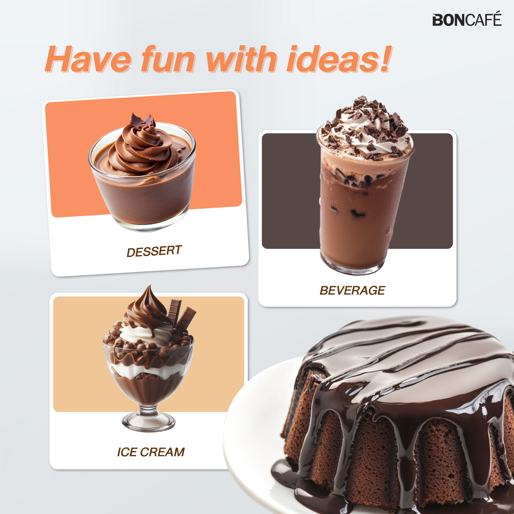 Dissolve Bonchoco powder in hot water or milk, pour into a cup, and serve. For iced chocolate, simply add ice cubes.