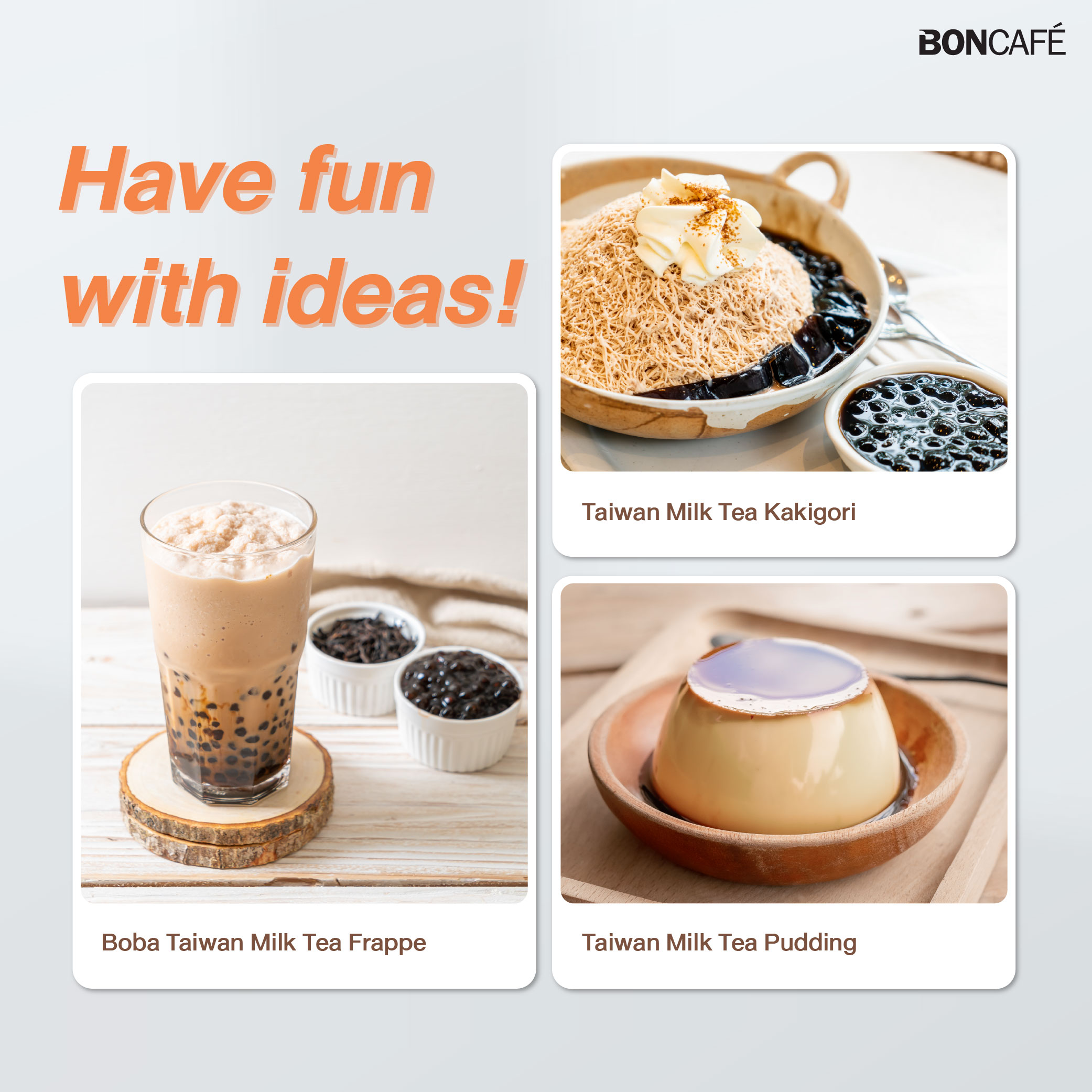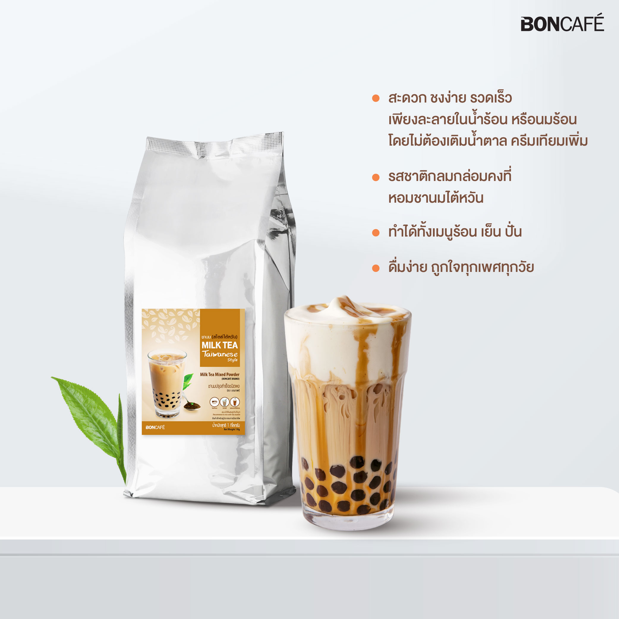 Taiwan-style milk tea powder from Boncafe is an instant beverage that can be prepared hot or iced. Carefully selected high-quality tea leaves are extracted using a special method to retain the authentic flavor and aroma of real tea leaves. The tea is then blended with milk and other secret ingredients to create a rich, creamy taste, delivering the genuine flavor of Taiwanese milk tea or bubble tea in every sip.