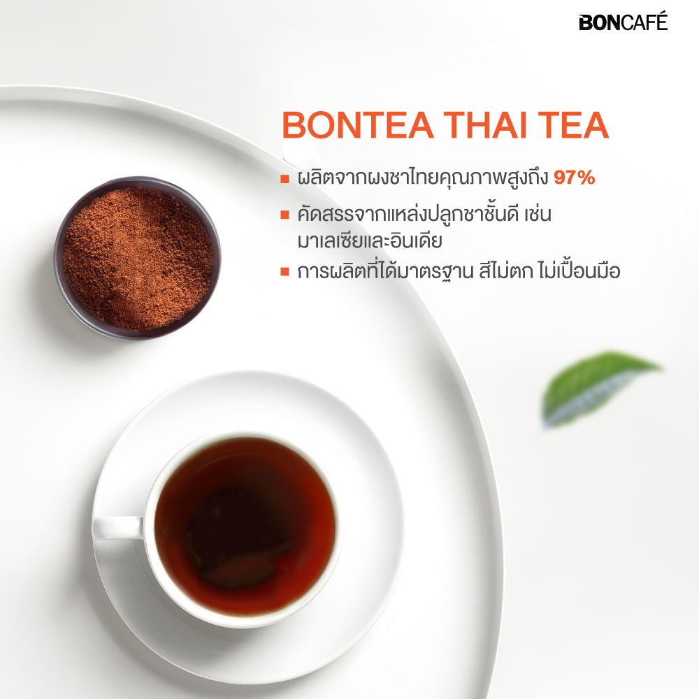 Experience the authentic taste of traditional Thai tea with Bon Tea Original Thai Tea. Made from 97% high-quality Thai tea powder, this tea delivers a rich, smooth flavor and a distinctive aroma, with a naturally vibrant orange color. Carefully selected ingredients come from premium tea-growing regions such as Malaysia and India, crafted with Boncafe’s unique formula to ensure a fragrant, authentic Thai taste. Natural & Safe: Colored with natural ingredients and processed under strict quality standards to ensure the color stays bright, won’t stain hands, and is safe in every cup.