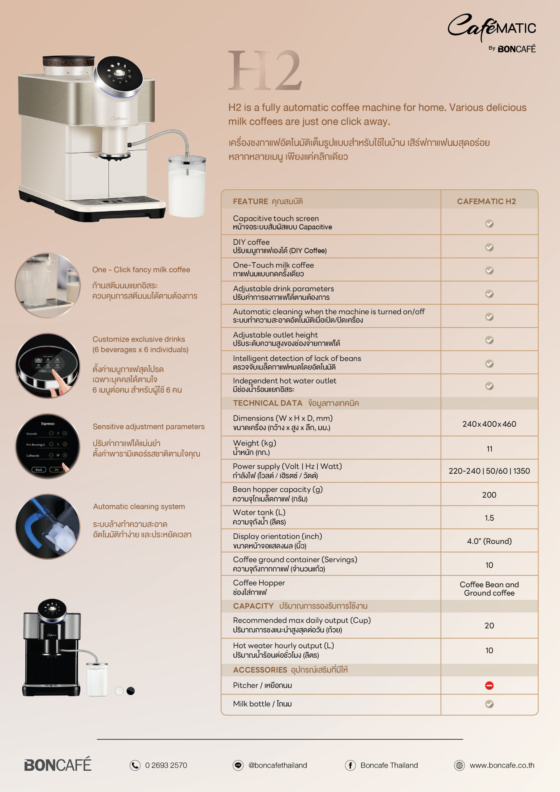 – ระบบ One-Touch (เฉพาะรุ่น H2 และ H3) ทำเมนูกาแฟนมได้ในคลิกเดียว