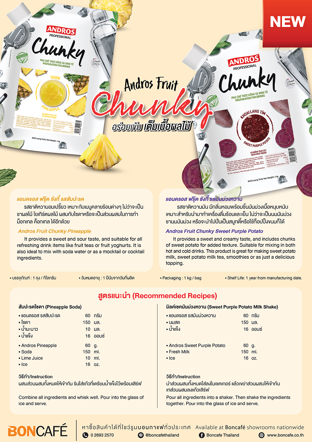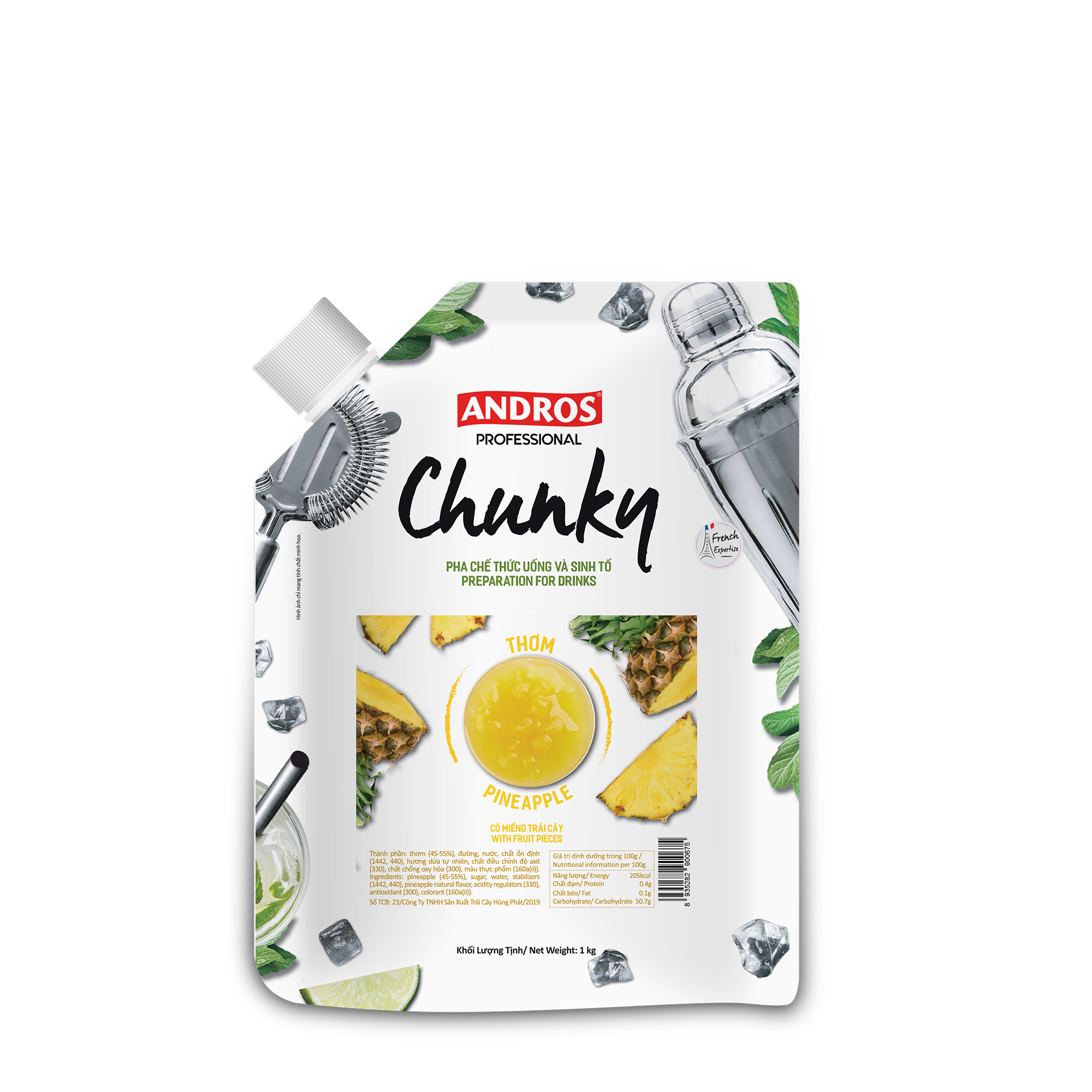 Andros Fruit Chunky รส Pineapple รสชาติหวานอมเปรี้ยว ให้รสชาติคงที่เหมือนกันทุกถุง เหมาะกับเมนูคลายร้อนต่างๆ ไม่ว่าจะเป็นชาผลไม้, โยเกิร์ตผลไม้, ผสมกับโซดา หรือจะเป็นส่วนผสมในการทําม็อคเทล ค็อกเทล ได้อีกด้วย
