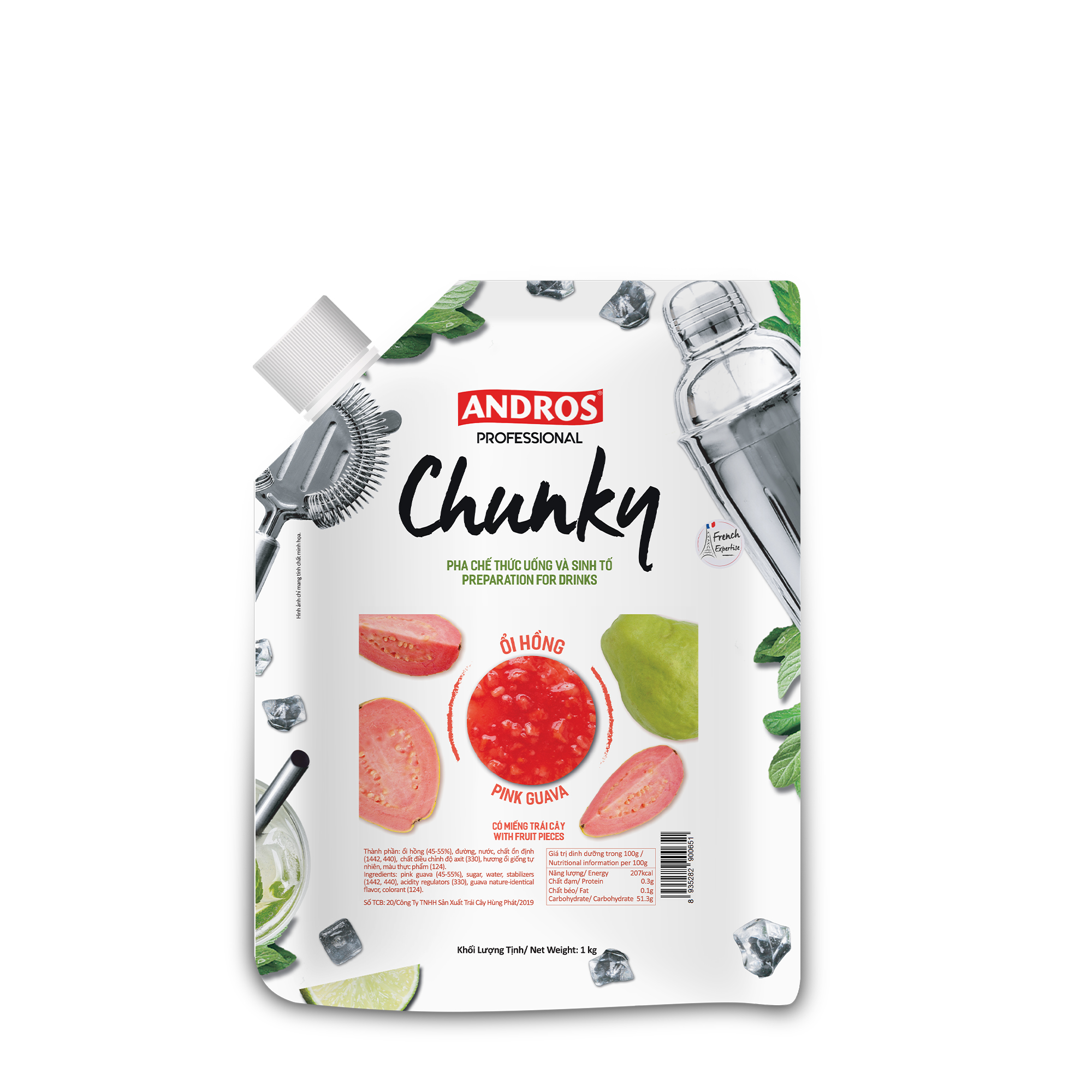 ผลิตภัณฑ์ Andros Fruit Chunky มีส่วนผสมของเนื้อผลไม้แท้ไม่น้อยกว่า 45%, ไม่ใส่วัตถุกันเสีย อีกทั้ง การคัดสรรเฉพาะผลไม้ที่สดใหม่ที่สุดเพื่อให้ได้รสชาติที่สมบูรณ์แบบในทุกถุง