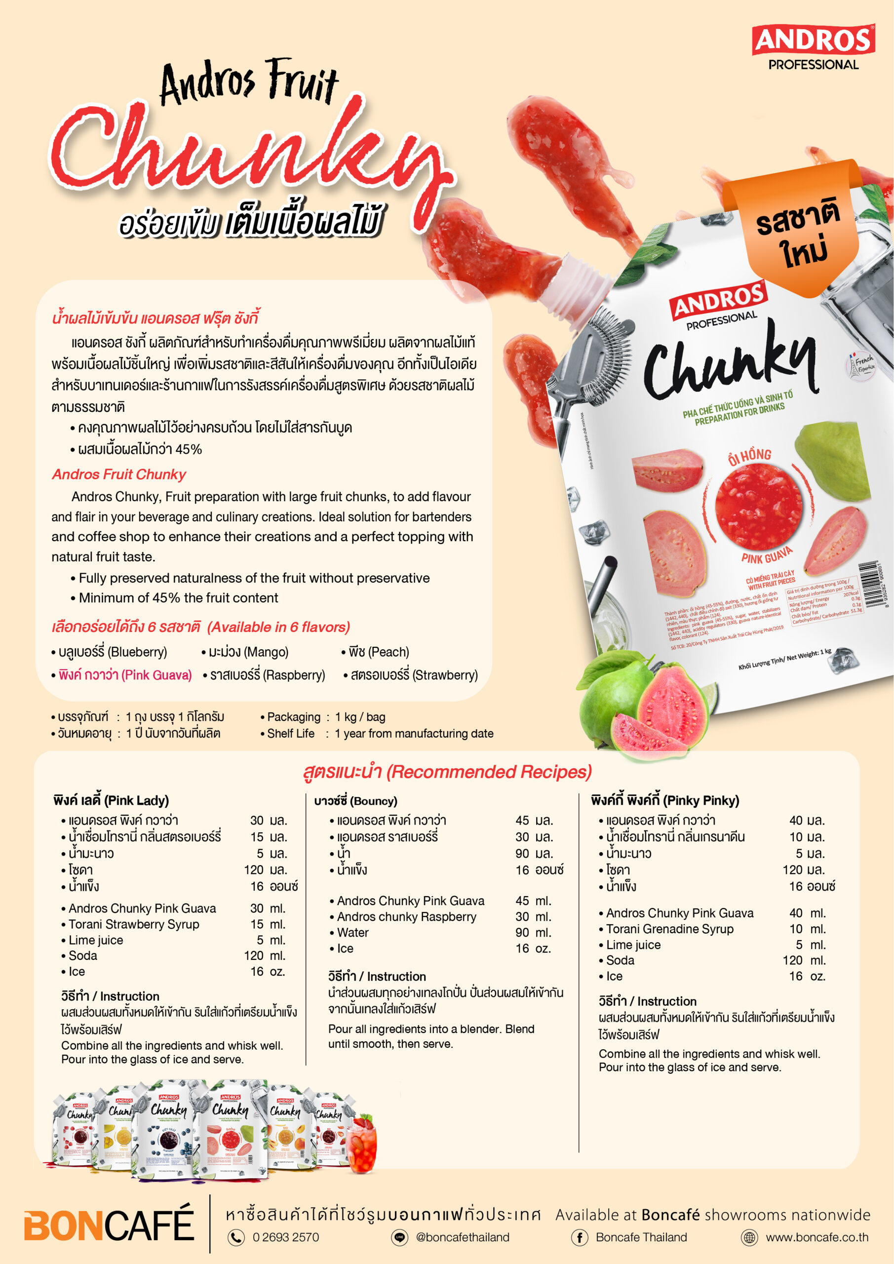 Andros Fruit Chunky รส Pink Guava หรือเรียกเป็นภาษาไทยว่า ฝรั่งชมพู มีสีแดงอมชมพูสวยงาม น่าดื่ม พร้อมกลิ่นหอมของฝรั่ง เหมาะเป็นอย่างยิ่งสำหรับทำเมนูสมูทตี้, ชาผลไม้ หรือแม้แต่การผสมง่ายๆ คู่กับโซดาก็อร่อยไม่แพ้กัน